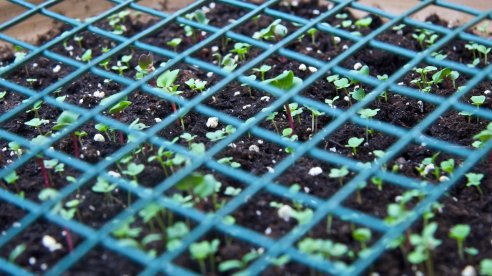A revista Gardens Illustrated ofereceu um pacote de sementes de uma mistura para salada. Segundo dizem, dá para cortar e crescer quatro vezes, se as folhas forem cortadas realmente novas. A germinação seria de sete a 21 dias, mas aqui foi mais do género ao segundo dia estava assim. Contém agrião, mostardas orientais e rúcula. A rede, já se sabe, é dedicada aos gatos.