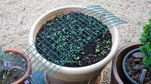 Também tive de pôr rede de galinheiro nos vasos grandes e quando faço sementeiras de rúcula.