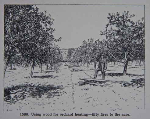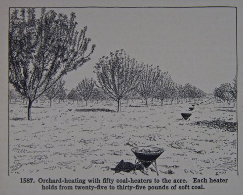 Na Standard Cyclopedia of Horticulture de L. H. Bailey, deparei-me com estas imagens que considero extraordinárias. Há cerca de 100 anos (esta edição é de 1915), considerava-se aquecer o ar em volta das fruteiras para as manter a salvo do gelo e da geada. Este é um método que segundo Plínio o Velho (Gaius Plinius Secundus), já os romanos praticavam há 2.000 anos.