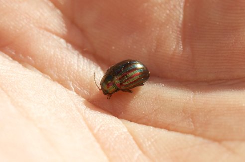 Apareceu pela primeira vez por aqui o ano passado, confinado principalmente a umas Alfazemas Lavandula dentata no jardim dos meus pais. Este ano está por tudo que é alfazema. É o Escaravelho-do-rosmaninho, Chrysolina americana.